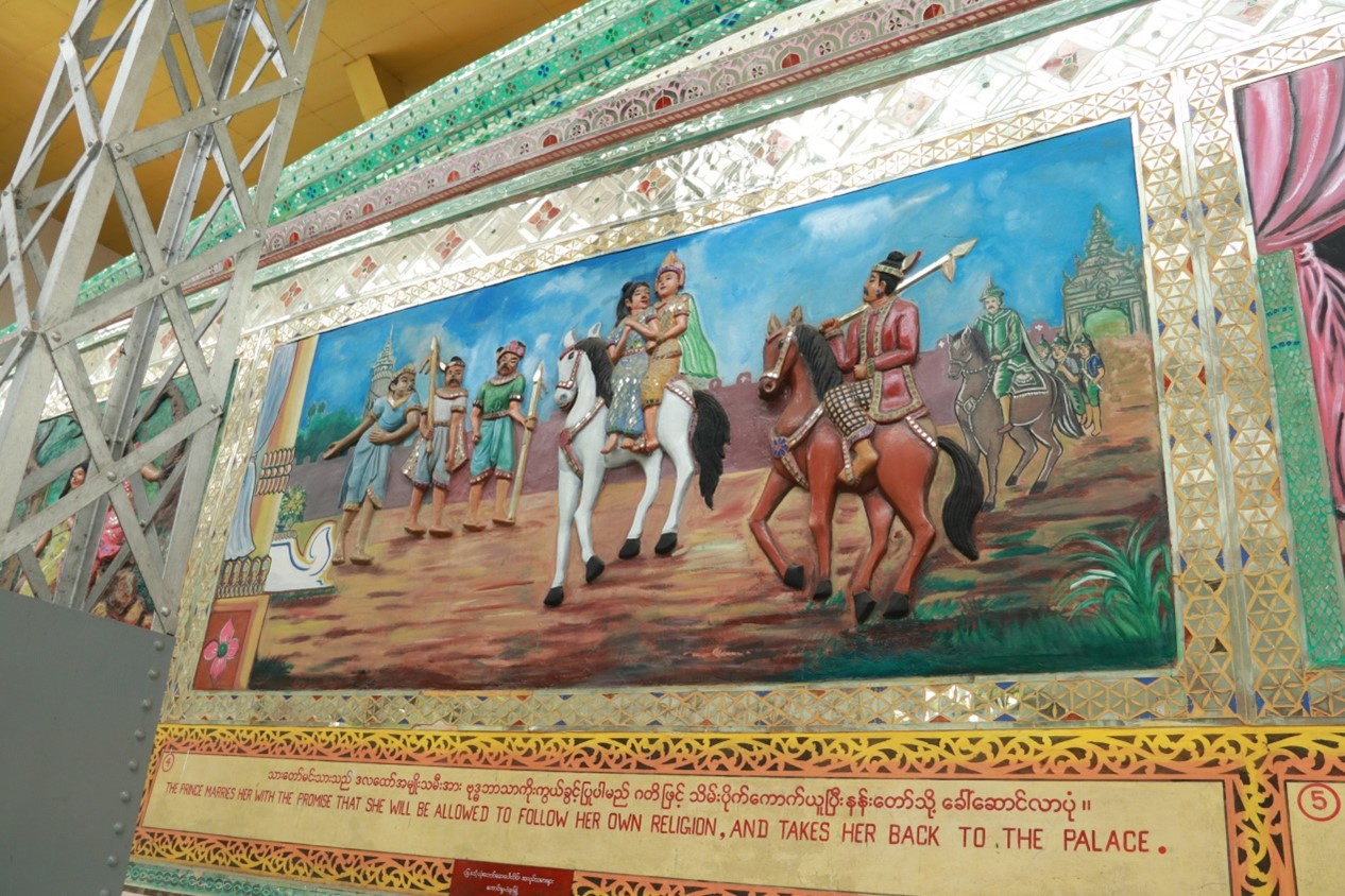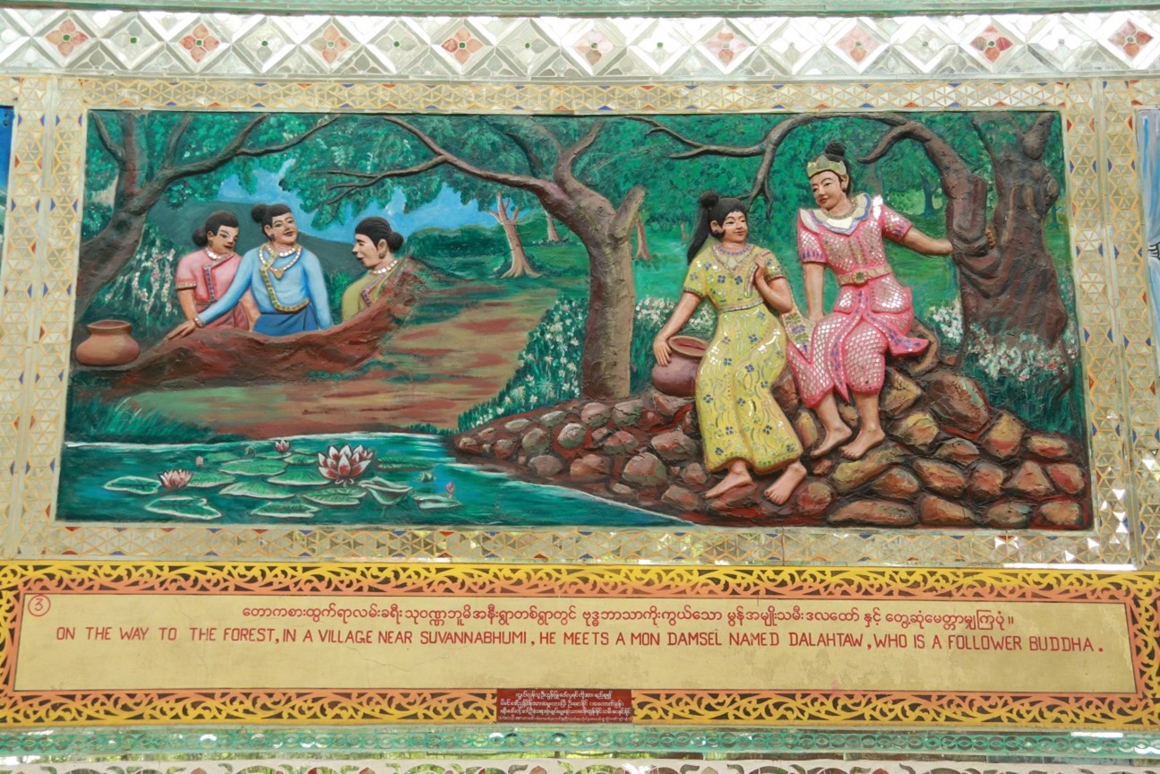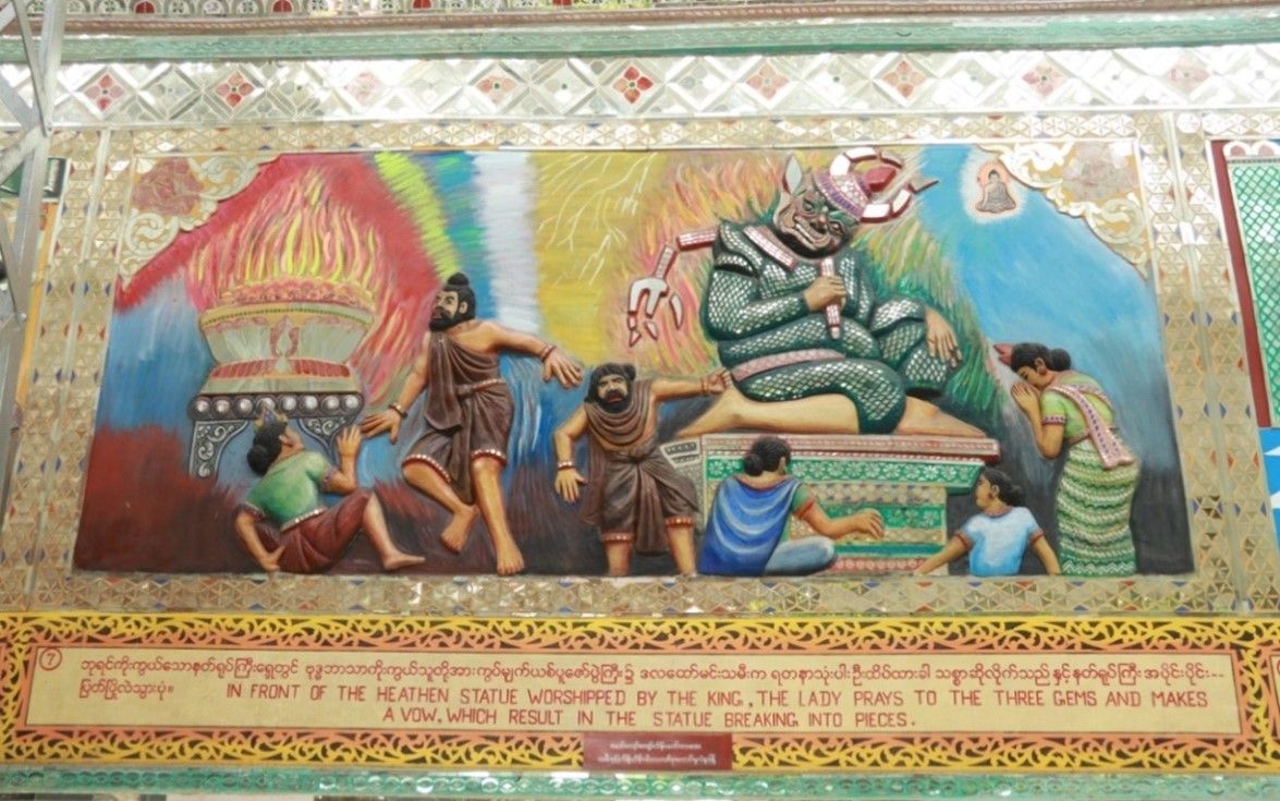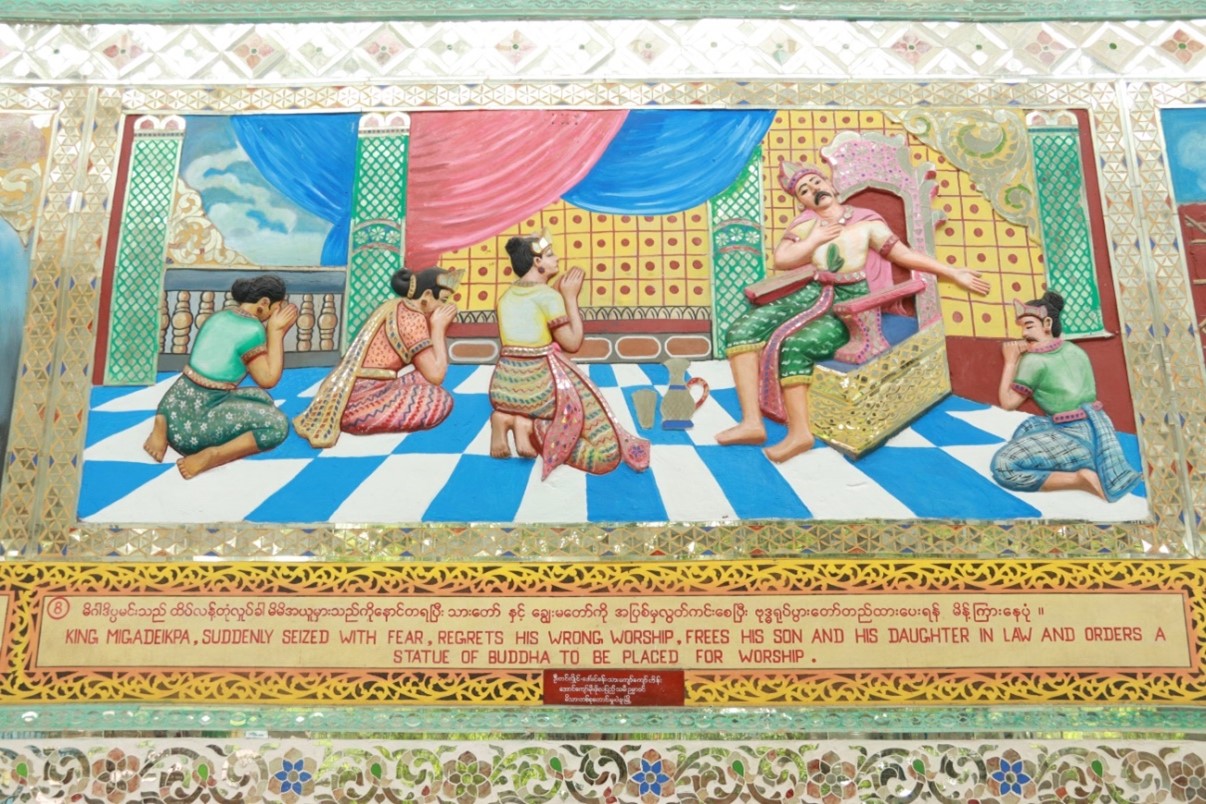 သမိုင်းမှတ်တမ်းတင်သရုပ်ဖော်ပုံများ ဟံသာဝတီမင်း(၁၃)ဆက်မြောက် မိဂါဒိဗ္ဗမင်းငယ်လှသည် မိစ္ဆာအယူလွဲမှား အုပ်ချုပ်ခါ ယစ်ပူဇော်ရန် သားကောင်များရရှိရေးအတွက် သားတော်တစ်ပါးအား တောကစားထွက်ခိုင်းပုံ။ ခမည်းတော်စေခိုင်းချက်အရ ဘုရင့်သားတော်သည် နောက်တော်ပါများနှင့် တောကစားထွက်လာပုံ။ တောကစားထွက်ရာလမ်းခရီး သုဝဏ္ဏဘူမိအနီးရွာတစ်ရွာတွင် ဗုဒ္ဓဘာသာကိုးကွယ်သော မွန်အမျိုးသမီး ဒလထော်နှင့် တွေ့ဆုံမေတ္တာမျှကြပုံ။ သားတော်မင်းသားသည် ဒလထော်အမျိုးသမီးအား ဗုဒ္ဓဘာသာကိုးကွယ်ခွင့်ပြုပါမည် ဂတိဖြင့် သိမ်းပိုက်ကောက်ယူပြီး နန်းတော်သို့ခေါ်ဆောင်လာပုံ။ နန်းတော်သို့ပြန်ရောက်ပြီးနောက် ဒလထော်သည် မိစ္ဆာနတ်ရုပ်ကြီးကို မကိုးကွယ်ဘဲ မိမိအဆောင်တွင် ဗုဒ္ဓရုပ်ပွားတော်ကို ထားရှိကိုးကွယ်ပုံ။ ဒိဋ္ဌိလွှမ်းမိုးသောမှူးမတ်တို့၏ ဂုံးချောမှုကြောင့် ဒလထော်နှင့်တကွ အပေါင်းပါတို့အား ကွပ်မျက်ယစ်ပူဇော်ရန် ဘုရင်ကြီးက အမိန့်ချမှတ်နေပုံ။ ဘုရင်ကိုးကွယ်သော နတ်ရုပ်ကြီးရှေ့တွင် ဗုဒ္ဓဘာသာကိုးကွယ်သူတို့အား ကွပ်မျက် ယစ်ပူဇော်ပွဲကြီး၍ ဒလထော်မင်းသမီးက ရတနာသုံးဦးထိပ်ထားခါ သစ္စာဆိုလိုက်သည်နှင့် နတ်ရုပ်ကြီး အပိုင်းပိုင်းပြတ်ပြိုလဲသွားပုံ။ မိဂ္ဂါဒိဗ္ဗမင်းသည် ထိတ်လန့်တုန်လှုပ်ခါ မိမိအယူမှားသည်ကို နောင်တရပြီး သားတော်နှင့် ချွေးမတော်ကို အပြစ်မှလွတ်စေပြီး ဗုဒ္ဓရုပ်ပွားတော်တည်ထားပေးရန် မိန့်ကြားနေပုံ။ မင်းကြီး၏ မိန့်ကြားချက်အရ တစ်တိုင်းပြည်လုံး မိစ္ဆာအယူစွန့်ပြီး ဗုဒ္ဓဘာသာသို့ ကူးပြောင်းကြခါ ဗုဒ္ဓရုပ်ပွားတော်မြတ်ကြီးကို တည်ဆောက်ကြပုံ။ မိဂ္ဂါဒိဗ္ဗမင်းတရားကြီး၏ သံဝေဂတရားဖြင့် တည်ဆောက်သော ဗုဒ္ဓရုပ်ပွားတော်ကြီးမှာ ကောဇာသက္ကရာဇ်(၃၅၆)ခုနှစ်တွင် လျောင်းတော်မူ ရွှေသာလျောင်း ရုပ်ပွားတော်ကြီး ဘွဲ့နာမဖြင့် ပြီးမြောက်အောင်မြင်သွားပုံ။