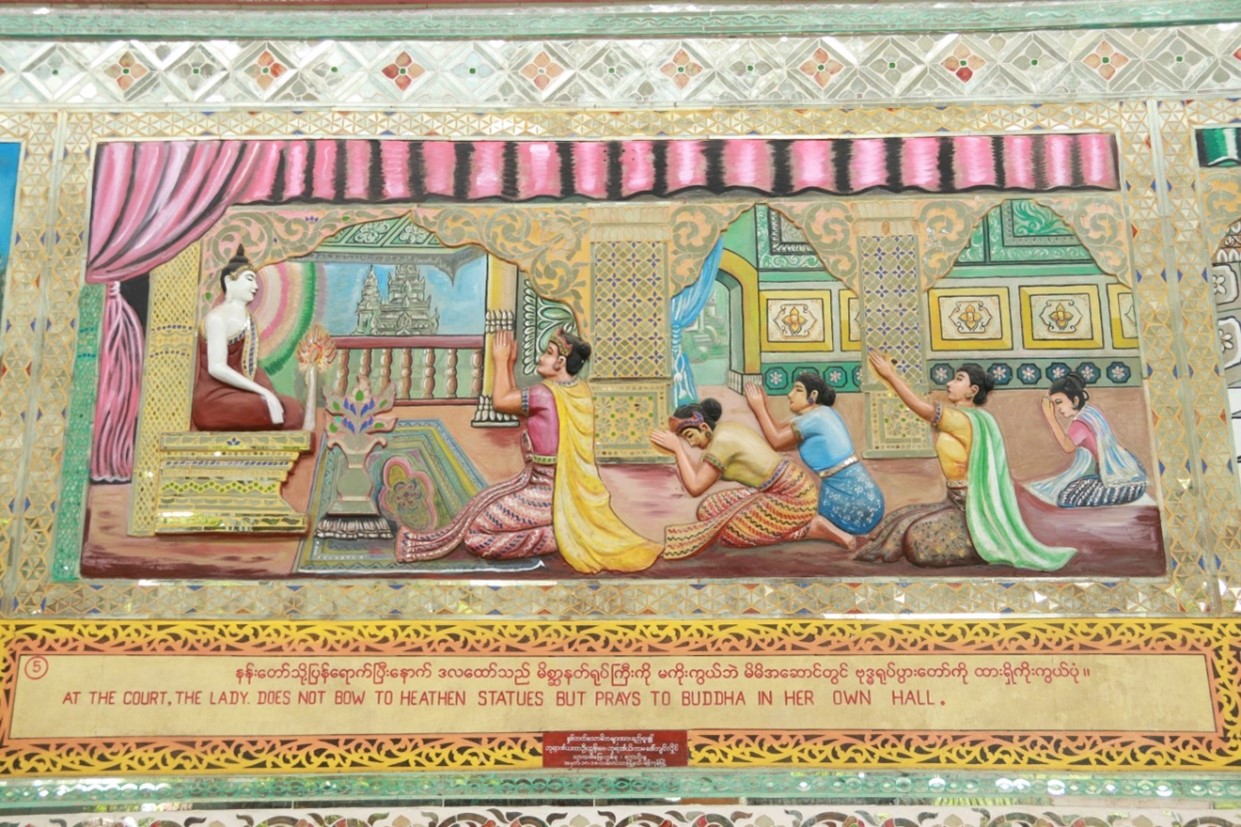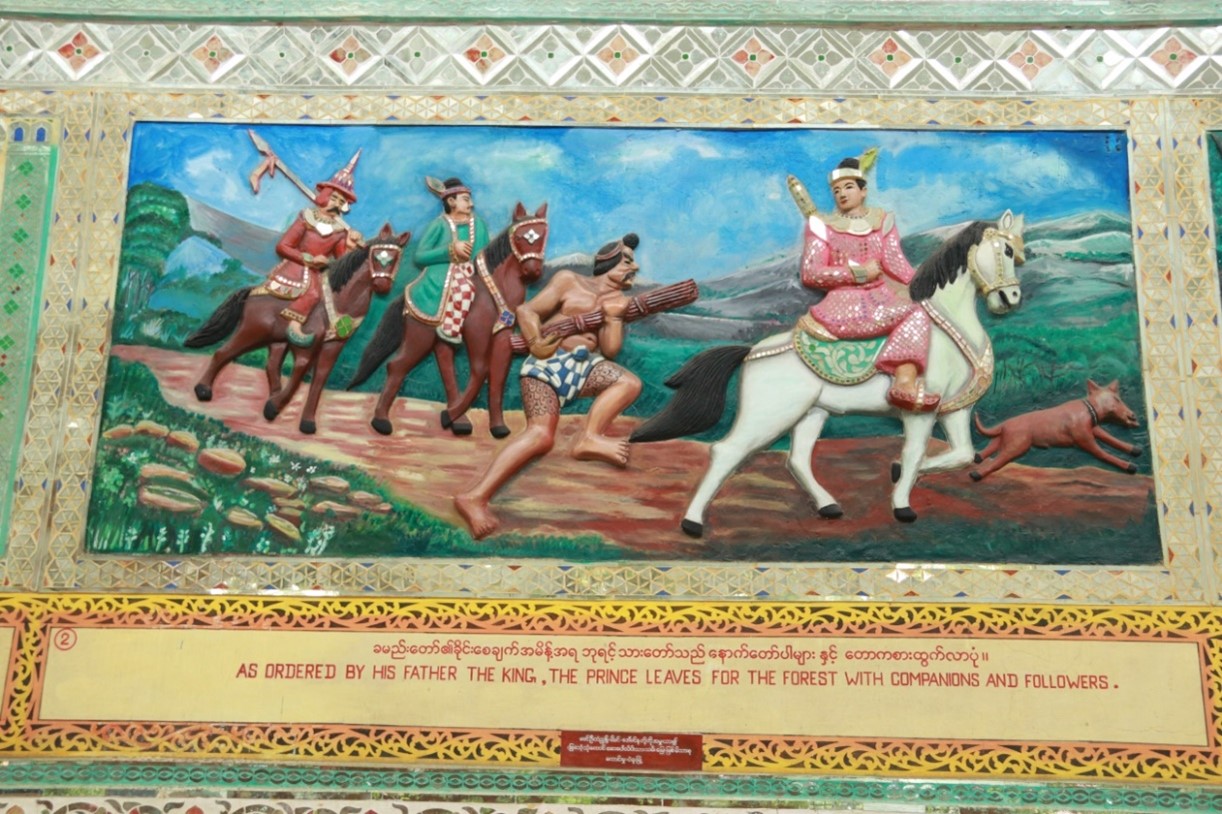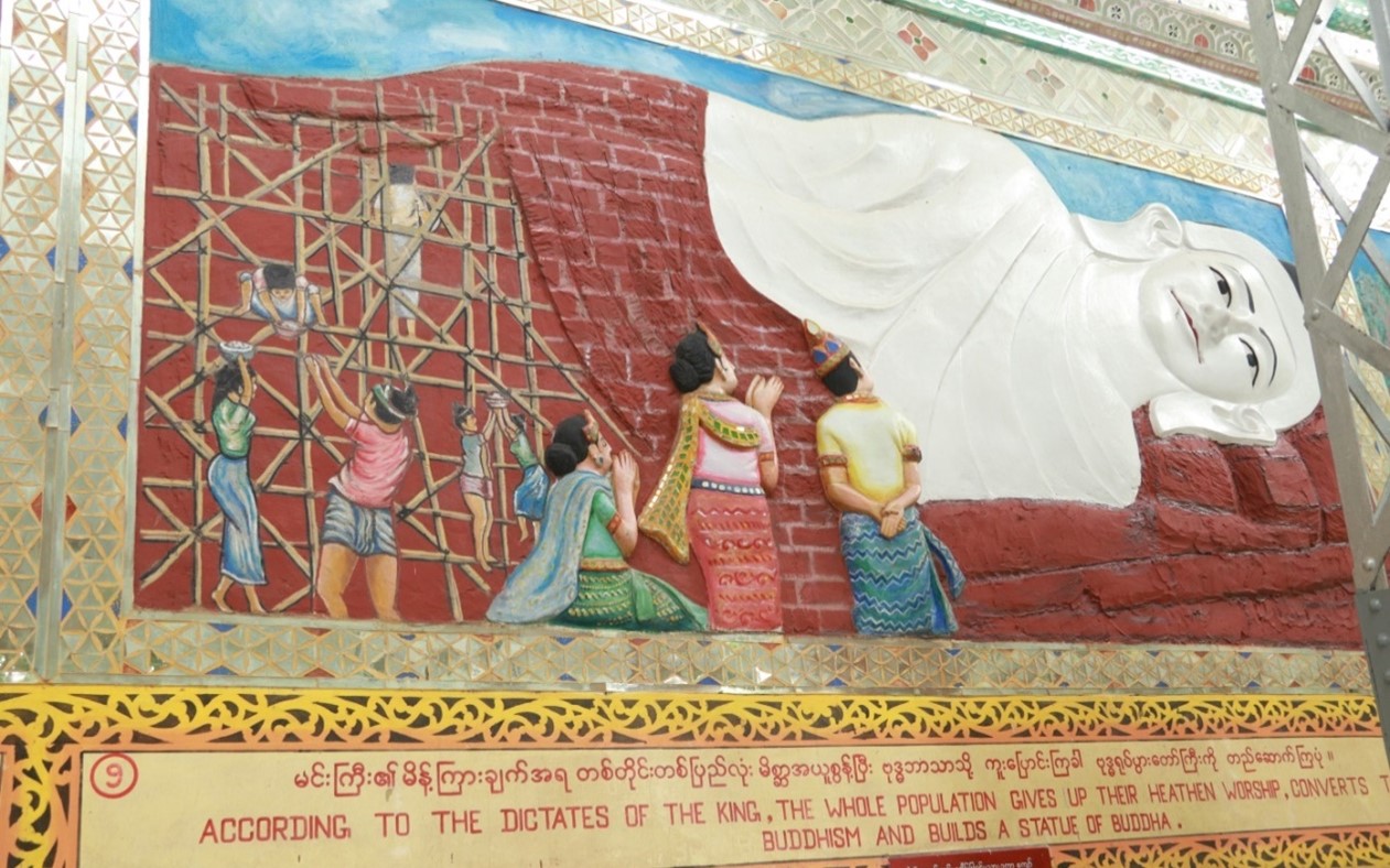 သမိုင်းမှတ်တမ်းတင်သရုပ်ဖော်ပုံများ ဟံသာဝတီမင်း(၁၃)ဆက်မြောက် မိဂါဒိဗ္ဗမင်းငယ်လှသည် မိစ္ဆာအယူလွဲမှား အုပ်ချုပ်ခါ ယစ်ပူဇော်ရန် သားကောင်များရရှိရေးအတွက် သားတော်တစ်ပါးအား တောကစားထွက်ခိုင်းပုံ။ ခမည်းတော်စေခိုင်းချက်အရ ဘုရင့်သားတော်သည် နောက်တော်ပါများနှင့် တောကစားထွက်လာပုံ။ တောကစားထွက်ရာလမ်းခရီး သုဝဏ္ဏဘူမိအနီးရွာတစ်ရွာတွင် ဗုဒ္ဓဘာသာကိုးကွယ်သော မွန်အမျိုးသမီး ဒလထော်နှင့် တွေ့ဆုံမေတ္တာမျှကြပုံ။ သားတော်မင်းသားသည် ဒလထော်အမျိုးသမီးအား ဗုဒ္ဓဘာသာကိုးကွယ်ခွင့်ပြုပါမည် ဂတိဖြင့် သိမ်းပိုက်ကောက်ယူပြီး နန်းတော်သို့ခေါ်ဆောင်လာပုံ။ နန်းတော်သို့ပြန်ရောက်ပြီးနောက် ဒလထော်သည် မိစ္ဆာနတ်ရုပ်ကြီးကို မကိုးကွယ်ဘဲ မိမိအဆောင်တွင် ဗုဒ္ဓရုပ်ပွားတော်ကို ထားရှိကိုးကွယ်ပုံ။ ဒိဋ္ဌိလွှမ်းမိုးသောမှူးမတ်တို့၏ ဂုံးချောမှုကြောင့် ဒလထော်နှင့်တကွ အပေါင်းပါတို့အား ကွပ်မျက်ယစ်ပူဇော်ရန် ဘုရင်ကြီးက အမိန့်ချမှတ်နေပုံ။ ဘုရင်ကိုးကွယ်သော နတ်ရုပ်ကြီးရှေ့တွင် ဗုဒ္ဓဘာသာကိုးကွယ်သူတို့အား ကွပ်မျက် ယစ်ပူဇော်ပွဲကြီး၍ ဒလထော်မင်းသမီးက ရတနာသုံးဦးထိပ်ထားခါ သစ္စာဆိုလိုက်သည်နှင့် နတ်ရုပ်ကြီး အပိုင်းပိုင်းပြတ်ပြိုလဲသွားပုံ။ မိဂ္ဂါဒိဗ္ဗမင်းသည် ထိတ်လန့်တုန်လှုပ်ခါ မိမိအယူမှားသည်ကို နောင်တရပြီး သားတော်နှင့် ချွေးမတော်ကို အပြစ်မှလွတ်စေပြီး ဗုဒ္ဓရုပ်ပွားတော်တည်ထားပေးရန် မိန့်ကြားနေပုံ။ မင်းကြီး၏ မိန့်ကြားချက်အရ တစ်တိုင်းပြည်လုံး မိစ္ဆာအယူစွန့်ပြီး ဗုဒ္ဓဘာသာသို့ ကူးပြောင်းကြခါ ဗုဒ္ဓရုပ်ပွားတော်မြတ်ကြီးကို တည်ဆောက်ကြပုံ။ မိဂ္ဂါဒိဗ္ဗမင်းတရားကြီး၏ သံဝေဂတရားဖြင့် တည်ဆောက်သော ဗုဒ္ဓရုပ်ပွားတော်ကြီးမှာ ကောဇာသက္ကရာဇ်(၃၅၆)ခုနှစ်တွင် လျောင်းတော်မူ ရွှေသာလျောင်း ရုပ်ပွားတော်ကြီး ဘွဲ့နာမဖြင့် ပြီးမြောက်အောင်မြင်သွားပုံ။